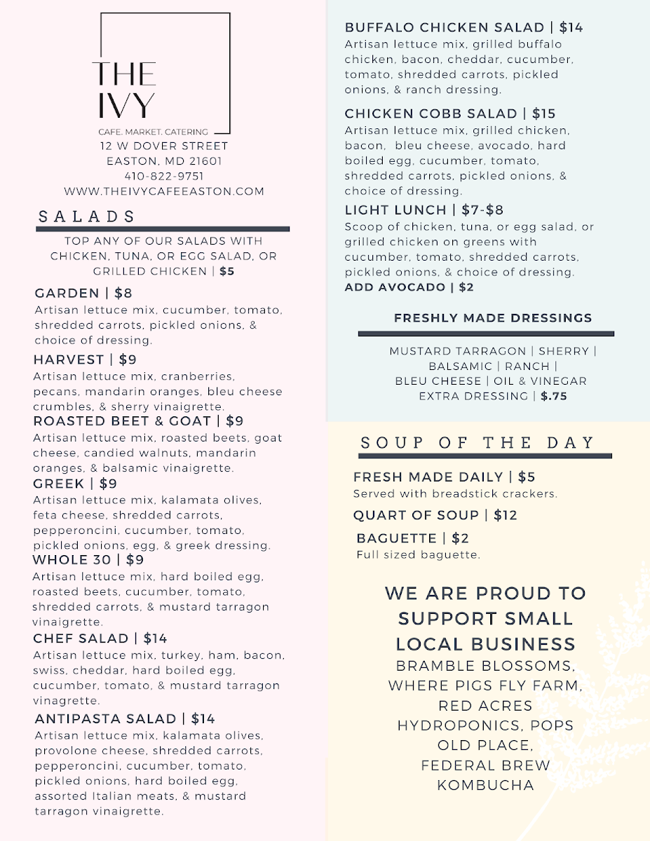 The Ivy Menu offers a delightful range of dishes that are as comforting as they are delicious. Located at 12 & 14 W Dover St in Easton, MD, this spot is perfect for anyone looking to enjoy a meal that combines both classic and contemporary flavors. Whether you're in the mood for a hearty lunch or a light dinner, the menu has something to suit every taste. From fresh salads to indulgent pastas, each dish is crafted with the finest ingredients. The Ivy’s commitment to quality is evident in every bite, ensuring that each visit is a memorable dining experience. With a cozy atmosphere and a variety of options, it’s no wonder the menu is a local favorite.